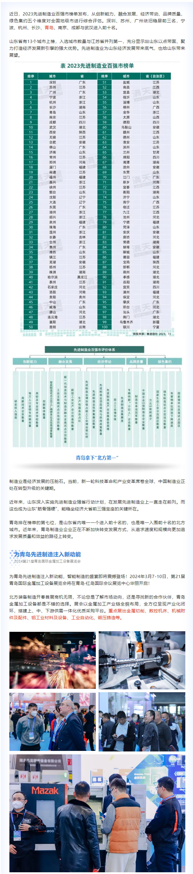 2023先進(jìn)制造業(yè)百?gòu)?qiáng)市發(fā)布,煙臺(tái)位列第23位